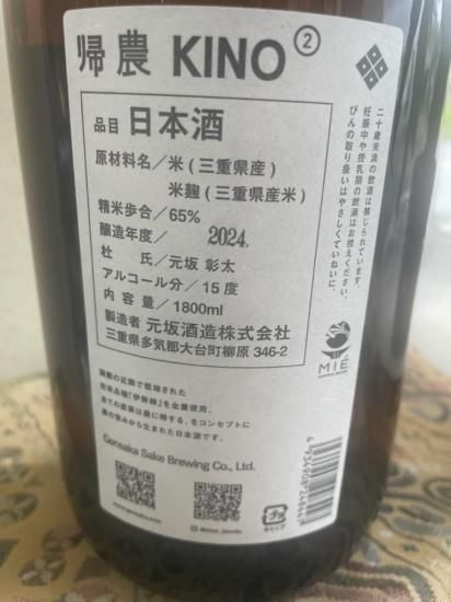 KINO2 帰農 生もと純米酒 1800ml 日本酒 2024BY 令和7年出荷 元坂酒造 酒屋八兵衛 三重の酒 伊勢錦 生もと造り 販売店限定酒
