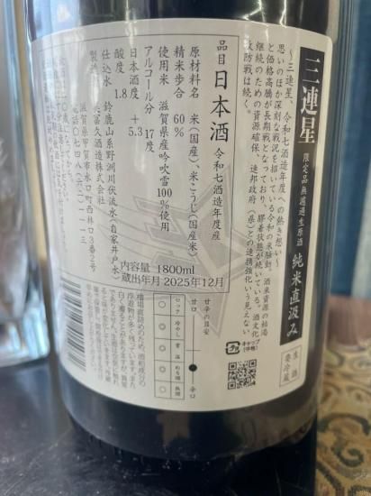 レギュラータイプの通年商品が急加熱急冷によるフレッシュさを閉じ込める「生詰」なのに対し、今回の商品が三連星(黒)純米では唯一の「生原酒」となります。