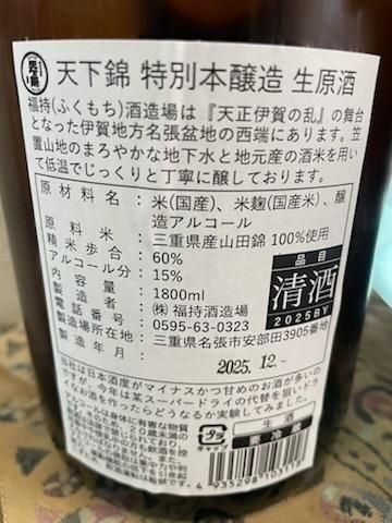 天下錦 特別本醸造 生原酒 1800ml 日本酒 令和7年 福持酒造場 2025BY 三重の酒 名張 安部田 全量山田錦 ※クール便指定
